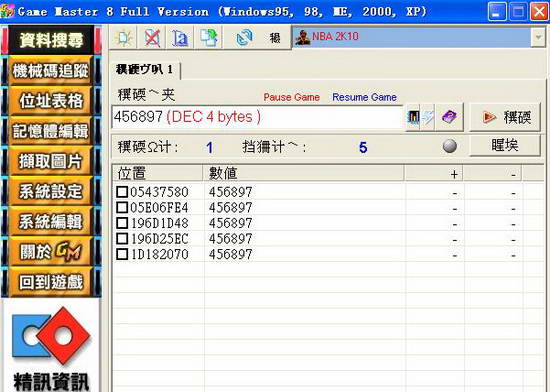 5、然后再切换到修改器中重复第三部的方法,再数值栏里输入你消耗后的SKILL数值,再搜索,这时候你会看到只剩下几个数值,如果还是多的话就继续搜~~不过我可以告诉你数值就是05E06FE4,像下图中输入