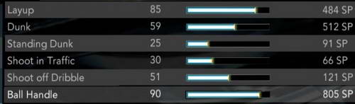 运球至少到80,有个甲壳虫蒂姆.哈达威经常做的胯下动作(查了一下是all star 4 和super star 4非常实用。加到90后,还有这个动作,速度更快,比罗斯和保罗的专属动作好用,应为在上篮的时候和防守对象距离一般很小,而罗斯动作要求的空间大,影响上篮的时机。
