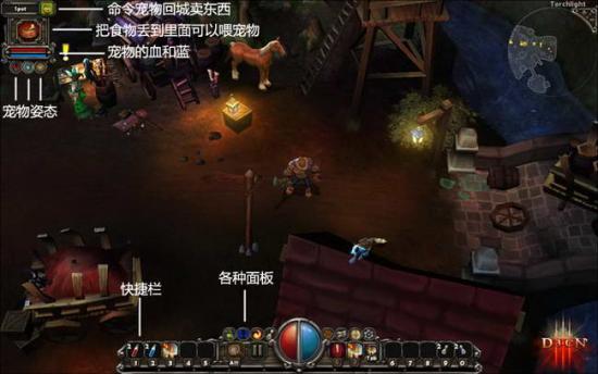 左上角是宠物面板:宠物可以帮你打怪,不过更重要的是可以帮你捡东西。最最重要的是,如同在暗黑史诗中的设定一样,你的宠物可以在你在地下城里激战的时候自己回城卖掉它捡到的东西。拾取物品时按Shift可以让宠物而不是你自己去捡。宠物不会死亡,但是当它红血或者空血的时候就变得很虚弱。没有敌人时,宠物的血会慢慢回复。宠物共有三种姿态:攻击姿态、防御姿态和被动姿态。 右上角是小地图。按键盘键可以切换小地图显示形式。当切换为上图所示的模式时,你可以点击最右上角的加减号放大或缩小地图。地图上的各种符号意义如下:
