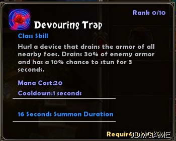 投掷一个陷阱,吸收敌人的护甲。吸收30%敌人护甲,并有10%几率击晕3秒