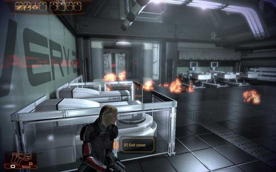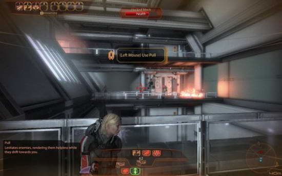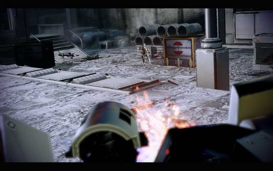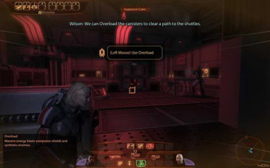 前进到Loading Bay,发现Quarian正在被一个巨大的守卫机器人屠杀,动画过后进入战斗。这个机器人有三层保护,一个是Shield,这个用Overload的技能可以打,第二层是Armor,用Wrap技能,打到Health的时候就很简单了,注意掩护。不过这个地方直接用子弹轰也不难。