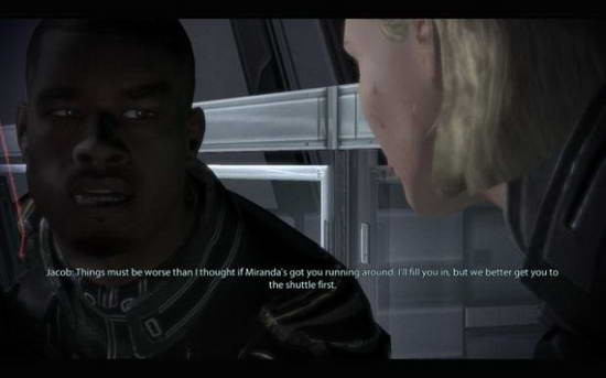 出来后,和Jacob说话,了解到他以前是Alliance的军人,但是看不惯军队和政治,自己又想干些其他的事,于是就加入了Cerberus。