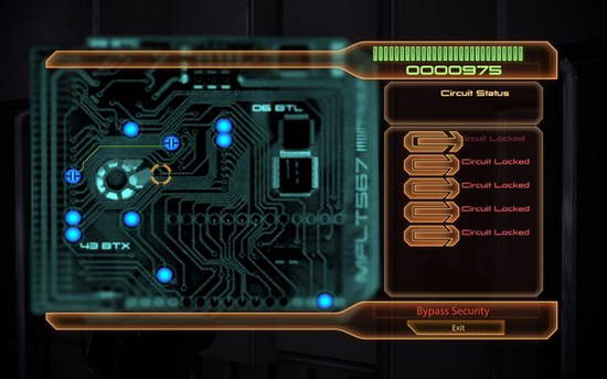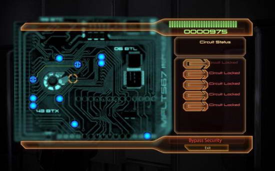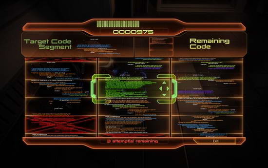 进入停机坪,在左边的一个房间里会找到一个加密的PDA,Hack的小游戏如上图所示。最上面的横条是时间,左上方“Target CodeSegment”右边的图是样图,要在下面找到一样的图,按空格(成功找到就像上图那样),一共要找三个,三个是不一样的图,不要碰到红色的图。