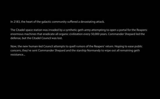 Citadel空间站被一支无机生命体(机械)的军队——Geth入侵了,他们想要为Reapers——一种在50000年前毁灭了所有有机生命的巨大机械种族——打开大门。Shepard领导了防守,但是Citadel议会被杀了。