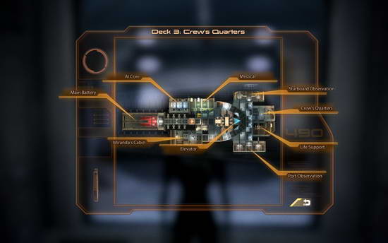 第三层是船员室,有医疗室。进医疗室会发现一代里的随舰医生Dr. Chakwas也在Normandy上。同时还可以接到支线任务,帮医生去找白兰地(Brandy)。在厨房那里也能接到支线任务,帮忙找食材。
