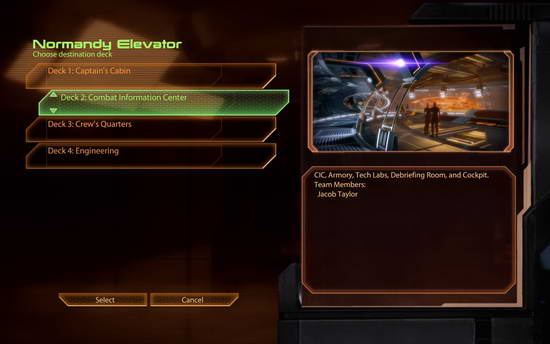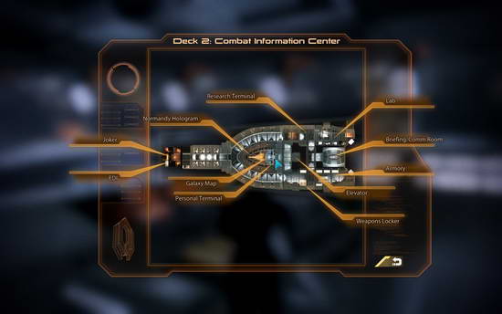 第二层是Combat InformationCenter(CIC)。在Weapon Locker处可以换武器(现在还没有武器可换)。Lab和Research Terminal现在还不能使用。Galaxy Map处可以控制飞船,旁边还有一个Private Terminal。另一边有一个女人叫Kelly,她会向Shepard汇报船员状况以及是否有邮件。