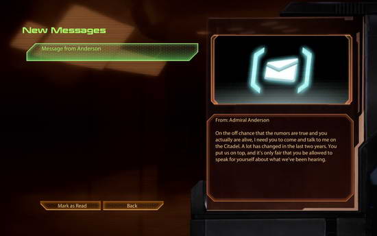 一共4层,第一层是船长房间,里面可以换装甲、开音乐、还有一个Private Terminal,这个可以接收邮件,有些支线是通过邮件接的,现在看邮件会受到Anderson的邮件,他是一代的Normandy船长,在Shepard成为Spectre后Normandy就给了Shepard。Anderson现在升为了Admiral(海军上将),他想让Shepard回Citadel和他见面。