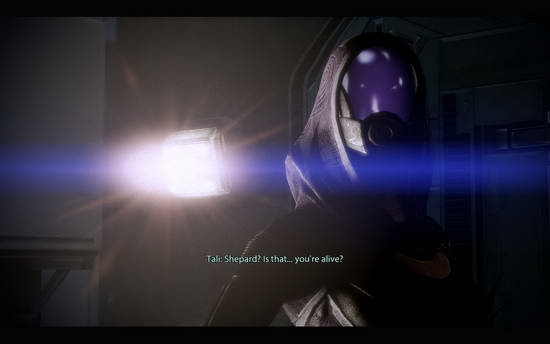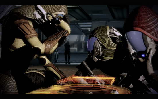 前进至一栋建筑物中,发现了几个Quarian人,双方正要开火时,其中一个Quarian阻止了,原来是Tali。