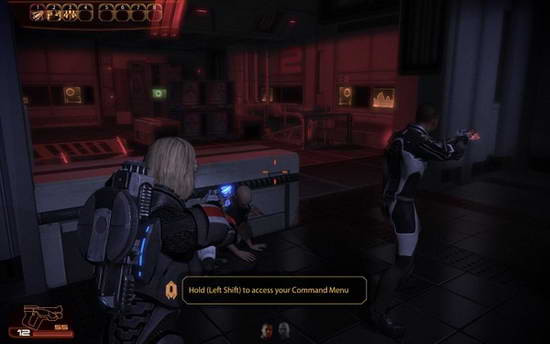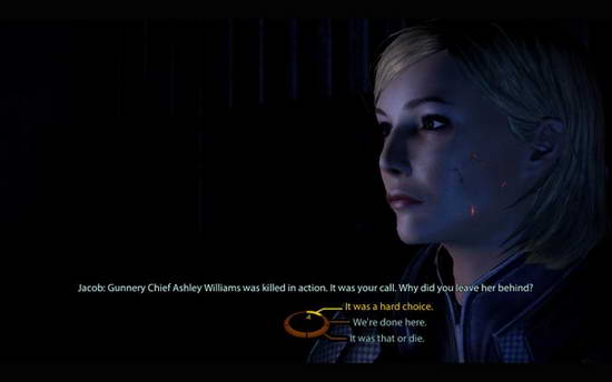 这里,注意右下角。在对话中有时候会出现这种画面。这里如果按鼠标右键Shepard会进行友善举动。如果出现在左下角则为红色标记,此时按左键会进行有敌意的举动。