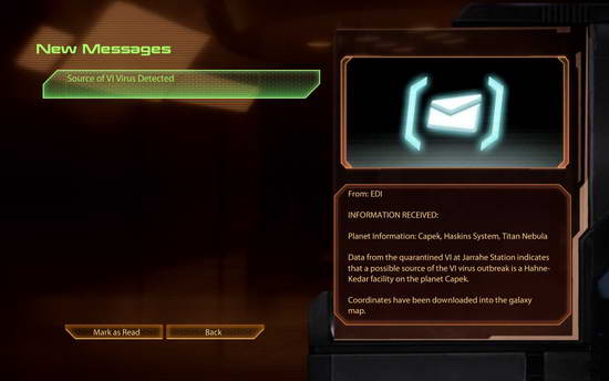 EDI又给Shepard发了一个邮件,说已经追踪到VI病毒的来源了,在Capek星球。(解锁Titan星云)