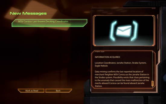 回到Normandy,EDI给Shepard发了邮件,它找到了坠毁飞船最后的停靠地点——Strabo星系的Jarrahe空间站。Shepard决定去那里调查机器人暴走的原因。