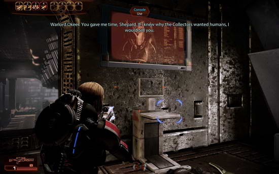 回到实验室,发现Okeer已经死了。墙上播放着他录制的遗言:你给了我时间,Shepard,如果我知道Collectors在攻击人类殖民地的话我一定会告诉你的。我的一切都倾注在这个原型上了。这个原型是完美的。在这里按空格。