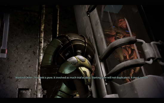 前进途中看到一个Korgan在和几个Blue Suns佣兵交战,解决完佣兵和和那个Korgan谈话。得知他是在实验室的培养罐里出生成长的(一路上看到的Korgan尸体都是),现在只有7天大。Jedore想要把他们训练成自己的军队,显然Korgan不听她的话。Okeer制造了这些Korgan,但是和他们说你们不是完美的,就把他们从培养罐里放出来了。同时得知Okeer不想找到治疗Genophage的方法。
