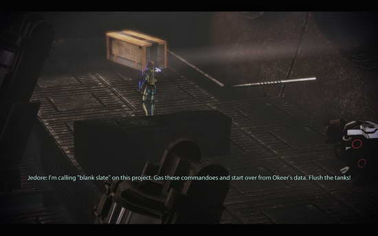 谈话途中,Jedore在下面指挥部队,准备摧毁Okeer的原型。Okeer让Shepard去阻止她。