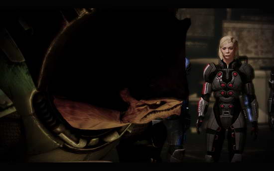 Korgan果然好战,刚一出来他就把Shepard按在了墙上。