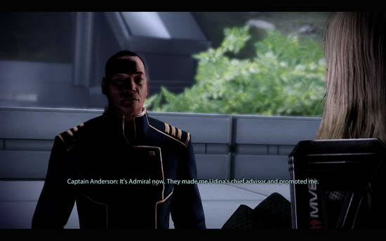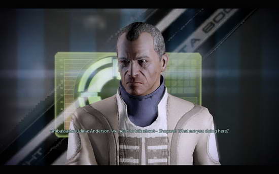Shepard来到大使馆,看到Anderson已经在等她了。Anderson现在是Udina大使的顾问,1代中,他是出了队友外最可靠的NPC,帮了Shepard很多(其实Anderson差点成为第一个人类Spectre,但是被Saren搅了)。