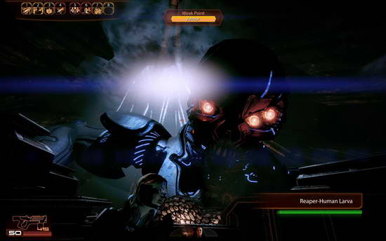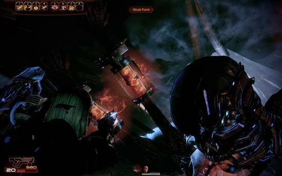 就在Shepard要撤离的时候,Human Reaper居然活了。。。瞄准它的眼睛或者心脏攻击,最终Boss其实很简单。