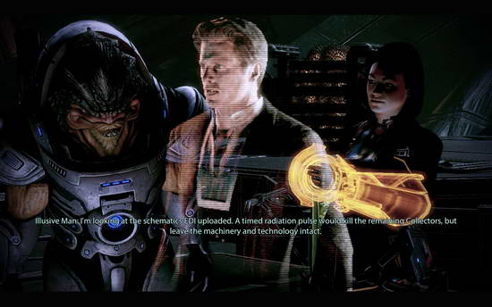 把Human Reaper打下去以后,Illusive Man传来通讯,希望Shepard不要炸毁基地,而是放射一种电磁脉冲,杀死基地里的生物,而使基地的设备完整。此处玩家自己选择,此处的选择应该会很大地影响到3代的剧情。