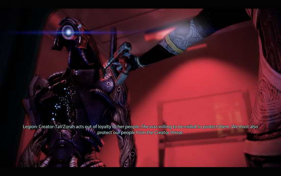 回到飞船,看到Tali正用枪指着Legion,指责Legion扫描了Tali的数据,并且要传给Geth。此处说服技巧高科技化解纠纷,否则只能支持一方。