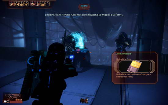 守住后,Legion还会问一次Shepard是要摧毁病毒还是把异教徒的程序改写。决定之后,要在规定时间内返回Normandy。