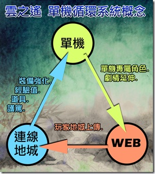 《云之遥》和Web系统两者之间的连动性仅止于地城转换吗?No~答案当然不是!经过博士从Domo小组那裡旁敲侧击之后,终于挖到《云之遥》最初期的设计构想。看过这张图之后,相信大家应该就非常清楚此次《云之遥》的整个概念了吧?至于到最后会发展成什麽样子,就请玩家继续期待萝!