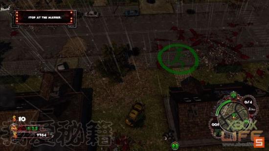 呼~开了好一段路后,终于到达了倖存者的家了!!(是说你难道不能住进一点吗?)可别以为到了倖存者家就一切ok喽~倖存者家外面可是守著超大一批忠实「活尸」等著你来解决,此时图片上的所有红圈圈标示的活尸都是得完全清除的!!大开杀戒的过瘾时间到啦!!玩家不但可以用最传统的方法整批辗过之外,在拿到弹药后也可以疯狂扫射他们~或者是按个X键甩尾来个碾~很~大~~~