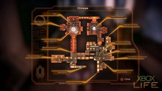 相较于前作,《质量效应2》的平面地图从简单的线构图转变成详细的图片标示,让玩家可以更清楚的看到整个区域的平面图。但是笔者希望地图可以再加回缩放功能,现在的地图无法缩放,偶尔想要走到某个店面买东西时,都会看不太清楚要如何从这裡走到那裡,经常造成笔者的困扰。