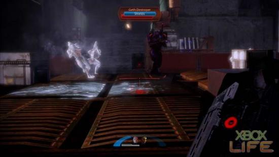 这是玩家按LT之后的瞄准视点,左方发蓝光的队友正施展超能力拉人,当敌人腾空升起时可趁机攻击。善用队友的各项能力可增强小队战力。