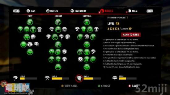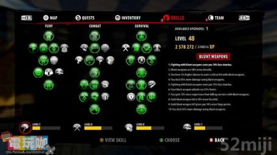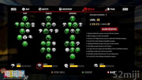 《死亡之岛:激流》新增了武器熟练度系统,这裡分成了钝器(Blunt Weapons)、尖锐武器(Blade Weapons)、拳套(Hand-To-Hand)、枪械(Firearms)四类,简单来说只要使用该系武器杀死僵尸,就可以累积熟练度升级,并且获得该等级对应的能力加乘。