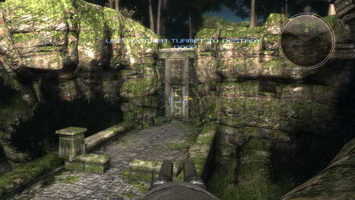 打掉一大群敌人,不要一直探头,不然死的很快。一次探头杀一次。到达底部,穿过吊桥,看到了尸体,捡下手雷,还有升 级武器的地方。
