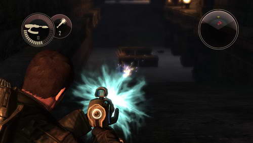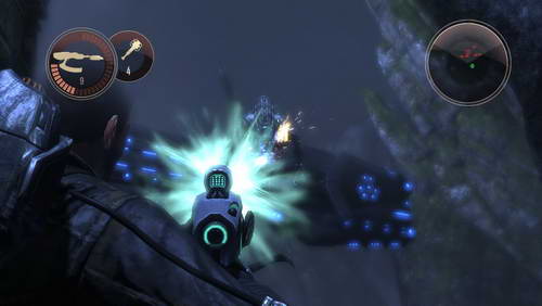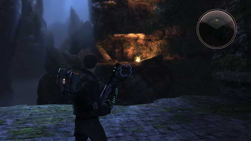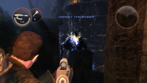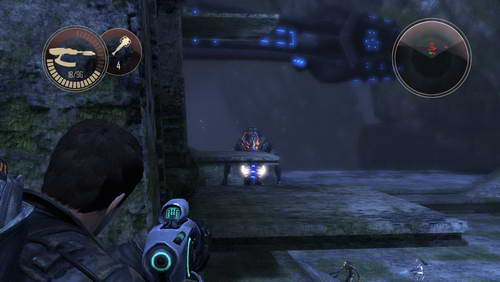 第一个BOSS旧登场了,一共2招,一招是连续的射击,躲在石柱后面轻松可以躲避,另一招是大的能量炮吧,照样躲,瞄准头 部和胸部,几回合就打挂了它,向右走,然后