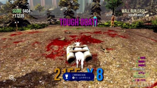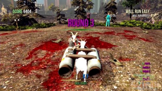 身为一隻超越普通山羊的超级山羊,你可以利用你充满黏性的舌头来拖行游戏中的物品或者是山羊或者是人类。你也可以衝上牆面飞簷走壁般的进行你的山羊跑酷,行走于牆面上可以获得的分数不低,但记得要先在地面助跑后朝牆壁跳才能在牆上奔跑。(相较于其他部分,小编反而觉得可以在牆面上跑步很正常……)