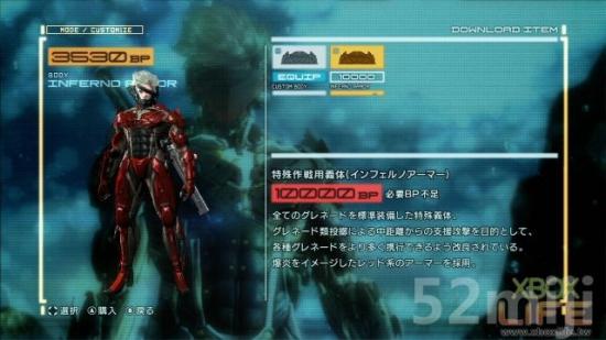 有购买《合金装备崛起:复仇》的玩家们也别忘了下载附赠的DLC雷电特殊造型:「Inferno Armor」地狱装甲,下载成功后就能在游戏中按下Back键开启自定义选单,利用于关卡中获得的BP点数购买后(10000 BP)就能帮雷电换装萝!