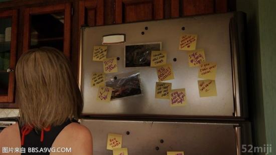 最右边的便条大意是:艾琳娜让德雷克回复制片人关于南极探险的事,女儿说我也要去!艾琳娜说你先把你房间整理干净,我们再谈……(一家子都不爱整理东西,老妈好意思说女儿,女儿在看了他们房间凌乱的东西后,还吐槽了一句,大家可以留意一下,情节跟冰箱上的对话能对上!)