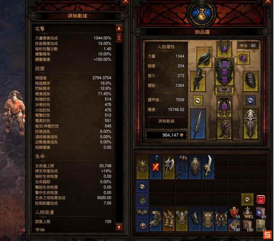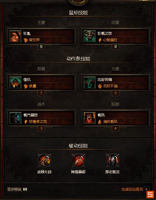 头几次失败,我发觉打不赢不是因为抗不住。是长期打下去输出根本太低,而且回血只能依靠忘却苦痛,实在不够稳定。针对输出不够的问题,把跃击改为战斗暴怒,提高一点输出及爆击。而被动技能换成武器大师及无情暴虐,理由同上。忘却苦痛的符文也换成吸血符文,提供另一个较稳定的自保方法。还有在AH花了5万G买了个142力54体蓝戒取代64体31全抗金戒。