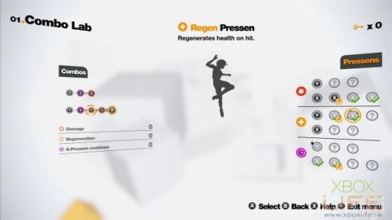 在战斗方面,A 键是迴避、X 键是拳头攻击而 Y 键则是脚踢攻击,此外 Nilin 还拥有三种不同的战斗风格:Power 属性能够破坏对方的防御姿态,进而给予敌人伤害;Regen 属性的攻击在击中动手后能够稍微恢复一点生命值;而最后的 Cooldown 属性则能在攻击到对手时,减缓特殊技能的冷却时间。玩家可以随时按下 Back 键叫出设定选单,并在选单中的 Combo 设定中自由地创造属于自己的攻击套路。而随著剧情的发展,Nilin 也会跟著习得许多具有不同性能的特殊能力,例如游戏初期就能获得的「Fury」,在启动期间能够取消所有设定好的 Combo ,让主角尽情的施展不间断的拳脚攻击痛揍敌人。