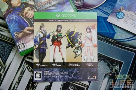 游戏外盒的封面人物是在《真三国无双7:帝国》中才追加的新角色荀彧,就连盒内附的一张摺页说明书上也都能看到他那张媲美杰尼斯的帅脸......而除了游戏光碟与说明书之外还包括了一张首批特典的下载兑换代码,首批特典的内容包括了: