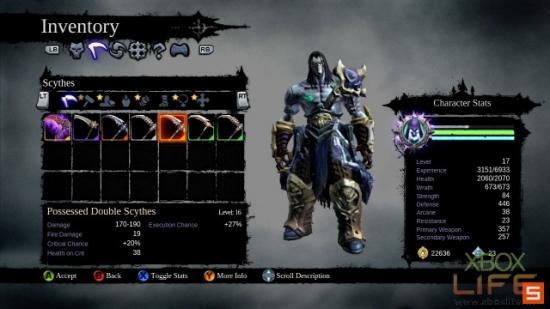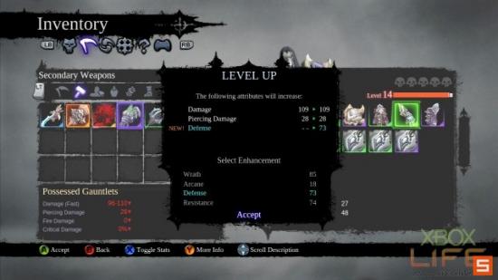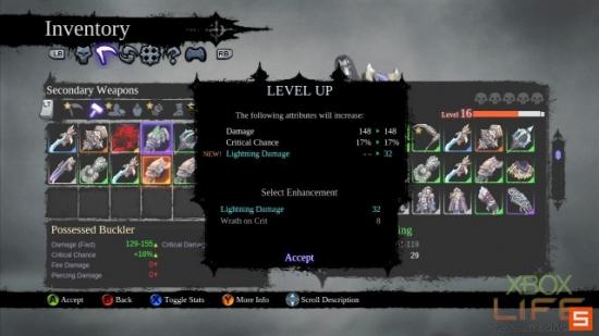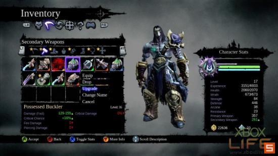 游戏初期直接买商人所贩卖的装备就已经很够用了,但随著等级的提升,你也会逐渐要对付等级愈高的敌人,此时商店裡的装备一定不敷使用,那这个时候就得靠合成/升级装备来拼。已知能够合成/升级的装备只有「橘框金字」的装备,当你朝著它按下A键并选择Upgrade键之后,便能用现有身上的装备进行合成,并赋予该传奇武器获得一定程度的经验值;一旦武器升级之后,便会提升一个等级已有的能力。为了让玩家能更清楚装备升级系统的架构,以下就用图说实作的方式解说: