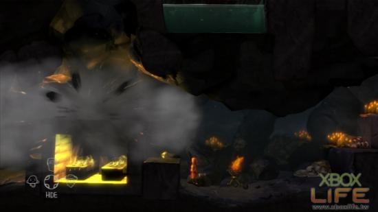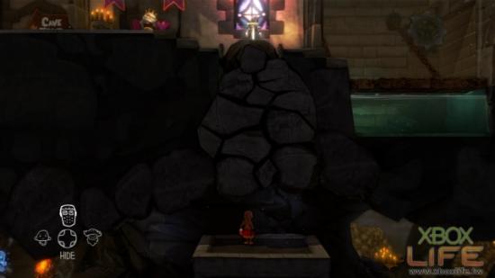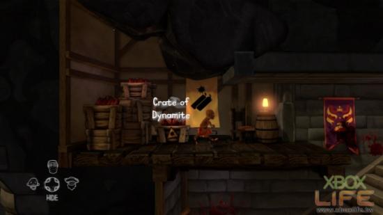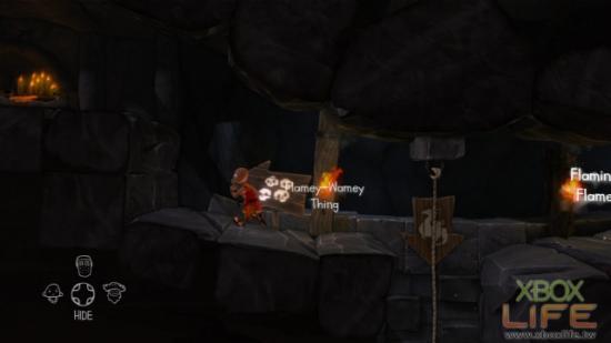 利用右边的火把点燃炸药后,把它扔到岩块的正下方引爆。