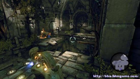 使用构造体返回东部房间,连接锁链前往对面区域取得骷髅钥匙。往下俯视你可以注意到这个石头恰巧在下层墙壁之上