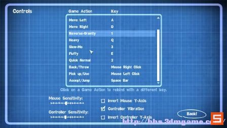 游戏控制选项wsad---控制方向 1-----反转重力 Q----加重(铁块化) 3----慢动作(时间变慢)