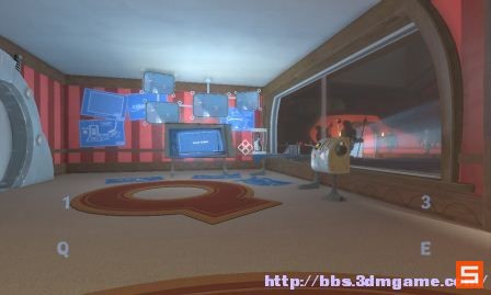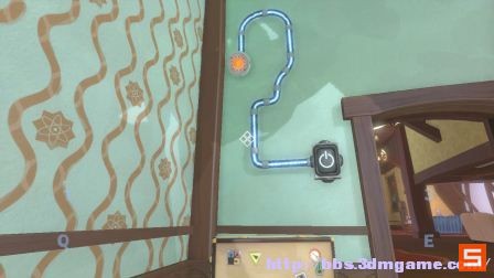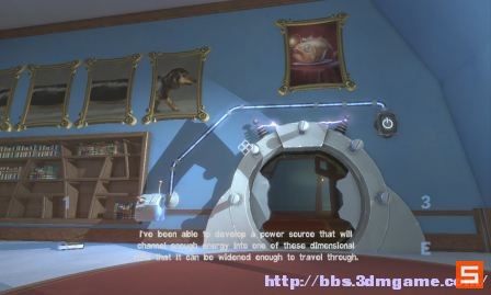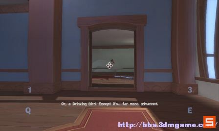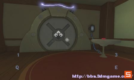 顺着楼梯一直前进,可以看到一只鸡在一扇门后,不停地啄着一个按钮,不用管它。这只鸡的作用是为了打开你进来的这个门。可以看到每按一下按钮,那根连着门的线就会亮一下充能,使门打开。这些电线跟传送门2里面地上的标记有异曲同工之感。