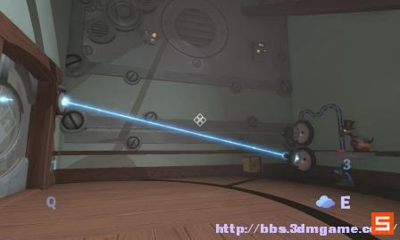 进入房间后,按下按钮。大嘴巴吐出一个纸箱子。在书柜里有一只鸟,将鸟放在桌子上,通过啄那个按钮会发出一道红色的激光。这关的问题在于,蓝色的激光接通可以使得第二扇门打开而第一扇门是关着的。