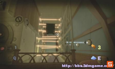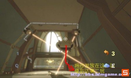 使用3,然后将箱子放在空中,箱子会下降很缓慢,这样就可以阻挡蓝色激光,玻璃外面的第二道激光扫描就会终止。趁这个时间,将紫色电池拿过去放到充能器上(若是直接拿过去,不管用不用3,紫色电池都会被毁掉)