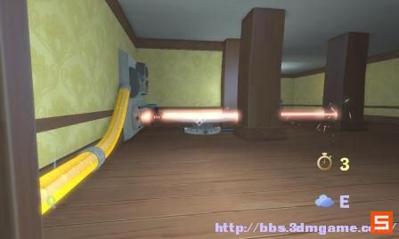 左边的那个激光器会自动清除异物(除了主角之外的其他东西),所以我们要先用E扔箱子,然后立马用3减缓时间,再跑到对面用E接住箱子,后面的几个地方也这么过。一直到达对面,拿到红色电池。用同样的方法,拿着红色电池回来。然后把红色电池放到充能器里面,再点击红色按钮得到一个保险箱,扔到大盘子的时候铁块化,门开。