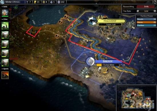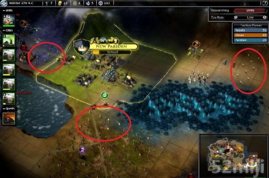 开始时奴隶比较少,先封锁几个关键隘口,然后后面的奴隶到了后就可以慢慢收网了。疯狂电脑不是很牛吗?我截了两张图是电脑首都位置奇佳的情况,一座城都有水晶铁矿啥都不缺的神奇位置。50回合了看看电脑的分数,我就不用说太多东西了。
