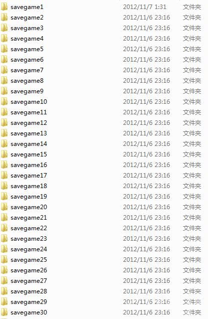 里面有这样30个存档文件夹,代表游戏中的30个档案位,打开你的存档所在的文件夹(第一次玩存档一般都在savegame1里)