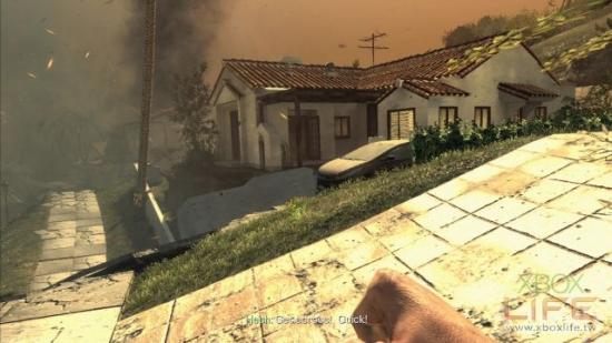 破门之后,来到一片火海的街上,靠右边走。看到有一台车停著的房子从门口进去,物品就在地板上。