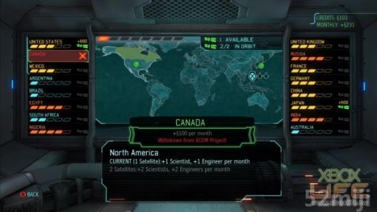 但这并不代表这些计画成员国是免费拿钱给我们花,玩家如果想要维持该国对幽浮计画的信心,就必须要利用行动来赢得支持才行。玩家可以建造卫星连结,藉以在该国家上空发射卫星监控外星人活动,这样就能获得更完整的情资。在玩家利用卫星扫描地球上的外星人行动时,有可能会同时出现三个国家内有外星人活动。三个不同的任务将会在三个国家内同时发生,玩家只能选择其中一个任务进行,受到关注的国家就会降低国内的恐慌值。当然受到玩家忽略的国家,在国内对外星人的恐慌就会提升,如果某个国家的恐慌到达极限,他们就会退出幽浮计画,而退出计画的国家就没有办法再用任何方式重新让他们加入幽浮的成员之中。