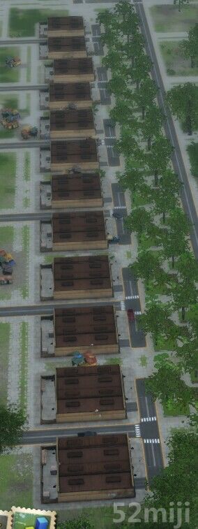 每隔一个建筑造一条主干道贯穿每条生产线,由于A-B的起点和终点确定后,AI路线的判断只考虑道路最短原则,所以密集的十字路口让不同的卡车有了很多不同的主干道选择结果,本来集中于一条主干道的交通会分流在很多交通主干道上。